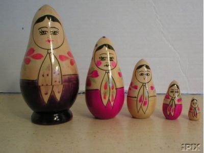 Both dolls were originally painted with traditional Semenov flowers which are now faded and almost entirely worn off from age and handling of this well loved pair of old dolls.