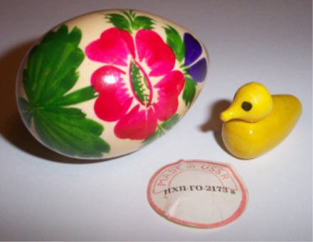 This is a traditional set of Semenov nesting egg maidens. They are egg-shaped and come to a point at the top. Each doll is painted with a face. The two outer dolls are decorated with traditional Semenov fingerprint swirls patterns, and the smallest doll is simply painted yellow.