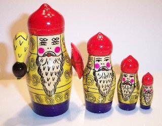 These are traditional Semenov warriors with domed helmets and white beards. The largest carries a yellow club and red shield.