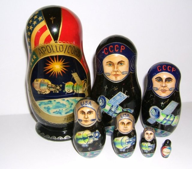 An extremely interesting conversation piece, this is set of 3 political satire wooden nesting dolls made in Russia. The largest, measuring 7.5" is a Bomb and depicts Vladimir Putin praying. The 5" is a Missile and depicts Boris Yeltsin in an Adidas shirt and playing tennis. The 4" is a Bullet with Mikhail Gorbachev wearing a magician's hat and holding a deck of cards. Not only is the set an unusual shape, but also opens at the bottom which is very rare.