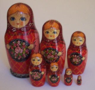Each doll in this set is uniquely painted. The largest doll holds a large sunflower, the next a chicken, and the next holds a bowl and has baby chicks at her feet.