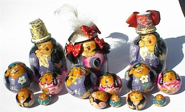Nice Art Style potbelly doll is made in Russia, probably in Sergiev Posad (Zagorsk). This lovely doll has a very detailed face, and nicely painted flowers. This tightly nested set is 10 dolls deep. A nice example of a modern Art Style Matryoshka.