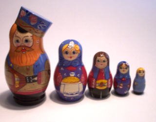 Two similar Russian Soldiers. The first is a solid, angular peg doll with red and gold uniform and black hat. The other soldier is slightly larger but is a wooden whistle.