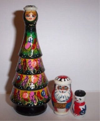 This tiny Santa is outlined in gold trim. Santa carries a bell and has a tree on his back. Inside is a snowman with blue hat and mittens. Finally, inside is a little green tree trimmed with gold. This set is very unusual in shape.