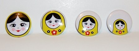 This cute little matyoshka is a toothpick holder. Dressed in green and pink, the blond girl holds a basket and flowers. There is a raised Ladybug just above the basket.