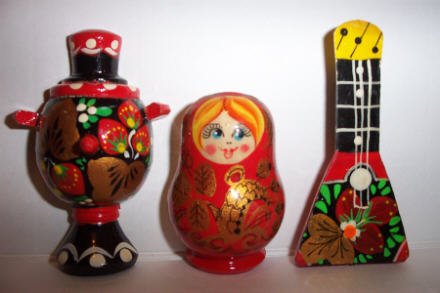 This matryoshka magnet is a girl with red scarf decorated with a brown bear. It appears to be the Russian cartoon bear Cheburashka.