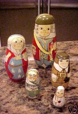 This Bill Clinton scandal dolls was a popular design in Russia. The first doll features Bill Clinton playing a saxophone followed by Monica Lewinsky the White House Intern, Paula Jones the Arkansas state employee who earlier sued Bill, wife Hillary Clinton and the small doll is the infamous cigar.