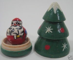 The 6 remaining dolls feature in order, Santa, Mrs. Claus, Santa in the chimney, Santa and the Christmas tree, a small child with bells and the smallest is again Santa.