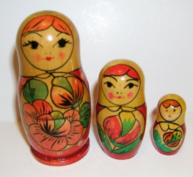These dolls are most likely from the Mordva region of the USSR. They are in excellent condition and all hand made. Each doll is holding flowers, fruit or vegetables. The tallest one in the nesting is approx 7" high down to the smallest which is 1 1/4" high.