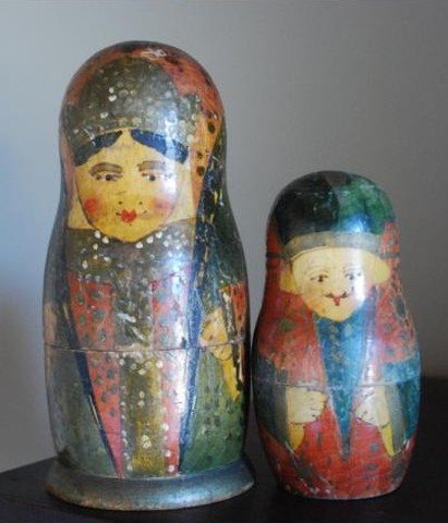 Antique Maiden holding a Pail & Umbrella, circa 1910s, Sergiev Posad. Tall Maiden compared to most sets of this time. Though in rough shape, she is unique and rare style. She still stands proud holding a pot in one hand and umbrella in another. Her previous owner is from France and collector of antiques. She found the doll in an antique shop in France and kept her for many years.
