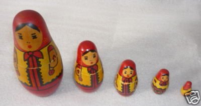 Russian Wooden doll, very good condition, no chips or cracks, it is approximately 5 1/2 inches tall. This doll is carved with geometric details. It seems to be made in two pieces but is glued together and does not open. She is stained with a dark wood stain, and has a pointed head.