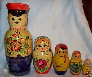 This is an older style Kirov doll with a red scarf. It is in good condition with an aged patina of the wood.