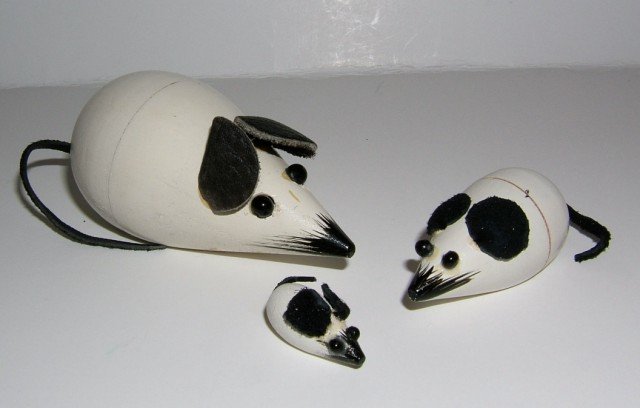 Vintage set of Japanese wood nodder kokeshi nesting dolls from the 1970's. The tallest or father kokeshi measures 3.5" tall, the middle doll/son measures 1.5" high, and the baby measures just 1/2" tall. The father and middle son are both nodders, but the baby's head is stationary. They are wearing green chinese-type tops with "frog" closures, and blue bottoms, except the baby, he's mostly just green. Really cute set of nesting dolls. This kokeshi doll set is in good vintage condition - hard to find many flaws.