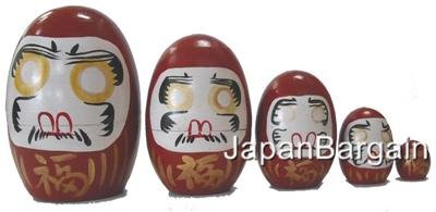 Unusual, grumpy looking Darumas. The first doll is tall and cylindrical in shape, and the inner dolls are more bullet shaped. The largest doll is 3.5” tall, and the set contains 6 dolls alternating in red and orange.