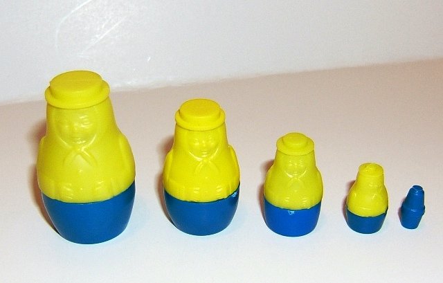 The largest doll has a large crack that has been glued and some paint scratches on the top of the head. The dolls have some chips around the opening of each doll. There are no marks or stamps on the bottoms of the dolls.