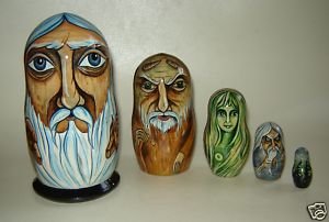 This doll features The Tale of Tsar Saltan by Aleksander Pushkin and features recreations of the illustrations by artist Ivan Bilibin, the doll is 7” and 9 pieces. This is a very high quality Art Matryoshka and is painted with great detail and great skill by the artist reproducing the Ivan Bilibin illustrations. The full title of the poem and opera is: The Tale of Tsar Saltan, of his Son the Renowned and Mighty Bogatyr Prince Gvidon Saltanovich and of the Beautiful Princess-Swan.