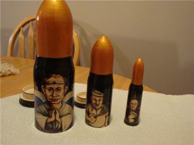 Russian Authors Matryoshka set is made in Russia and signed by the (St. Petersburg 2000) - each of the dolls has the name of the author on the front in Russian. The largest doll is 7.5” tall - very nice condition.